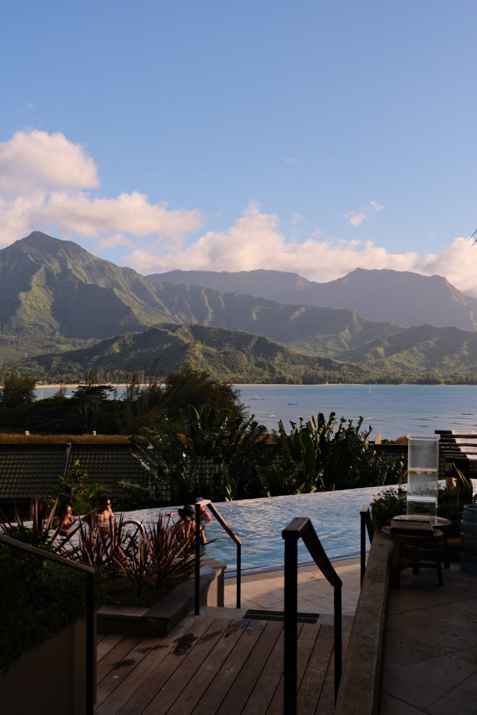 As someone who is interested in hospitality and tourism, I was keen to check out 1 Hanalei Bay, a new, award winning resort that sits on the cliff overlooking Hanalei Bay. The resort was breathtaking, even walking through the lobby was an unforgettable experience. The design complimented the natural beauty of the surrounding scenery while giving guests every modern luxury.. We opted for a high top table above the massive infinity pool and mountain range. We sipped a $17 non-alcoholic cocktail and watched the white sailboats dance around the bay.