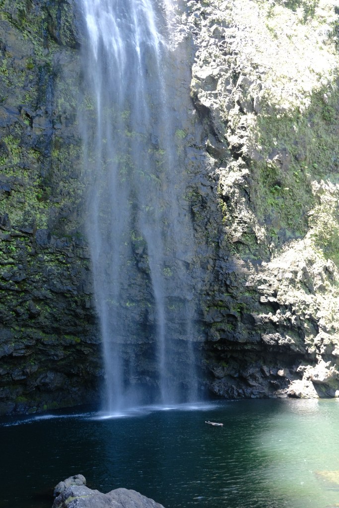 Once in the park, we set off along the Kalalau Trail towards the beach. This is a long trail with direct sun and no water. The hike to the beach is 3km, one way. The trail skirts the cliffside with stunning views down the Napali Coast. We hiked alongside native plants and the bluest water we had ever seen. The trail was dusty and felt longer than 3 km in the heat. We stopped to eat our snacks at the beach, surrounded by white sand and lush jungle. We decided not to swim at the beach as the waves were rough and we had our sights set on a waterfall swim.