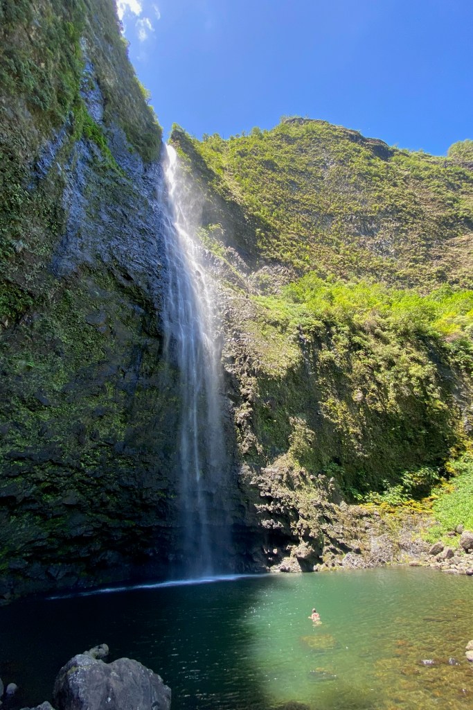 Once we popped out at the waterfall, it felt like we were in a different world. The crystal clear pool is surrounded by mossy rocks and filled by the 300 foot waterfall. The scale of it was unbelievable, and it was definitely the highlight of our trip to Kauai. We spent a few hours paddling around in the pool, exploring behind the waterfall, and relaxing on the rocks to eat our lunch. Be sure to bring strapped sandals, as the lava rocks in the pond are sharp and make it difficult to climb in and out.We began our hike back, ensuring that we gave ourselves enough time to catch the last shuttle out of the park.